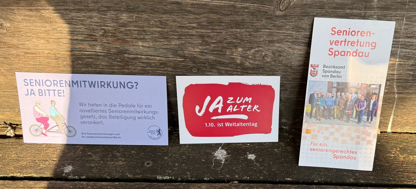 Am 1. Oktober, dem Weltseniorentag, haben Sie uns auf dem Spandauer Markt und in der Fußgängerzone in der Carl-Schurz-Straße treffen können. Wir konnten Ihnen im ein oder anderen Gespräch Tipps und Hinweise auf nützliche Adressen geben und von unserer Arbeit berichten. Die Seniorenvertretung Spandau wird übrigens im März 2027 neu gewählt. Vielleicht haben Sie Lust, sich zu bewerben. Kommen Sie auf uns zu, wenn Sie dazu Fragen haben.