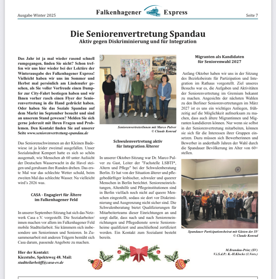 Die Winterausgabe des Falkenhagener Express ist erschienen mit einem neuen Artikel der Seniorenvertretung.