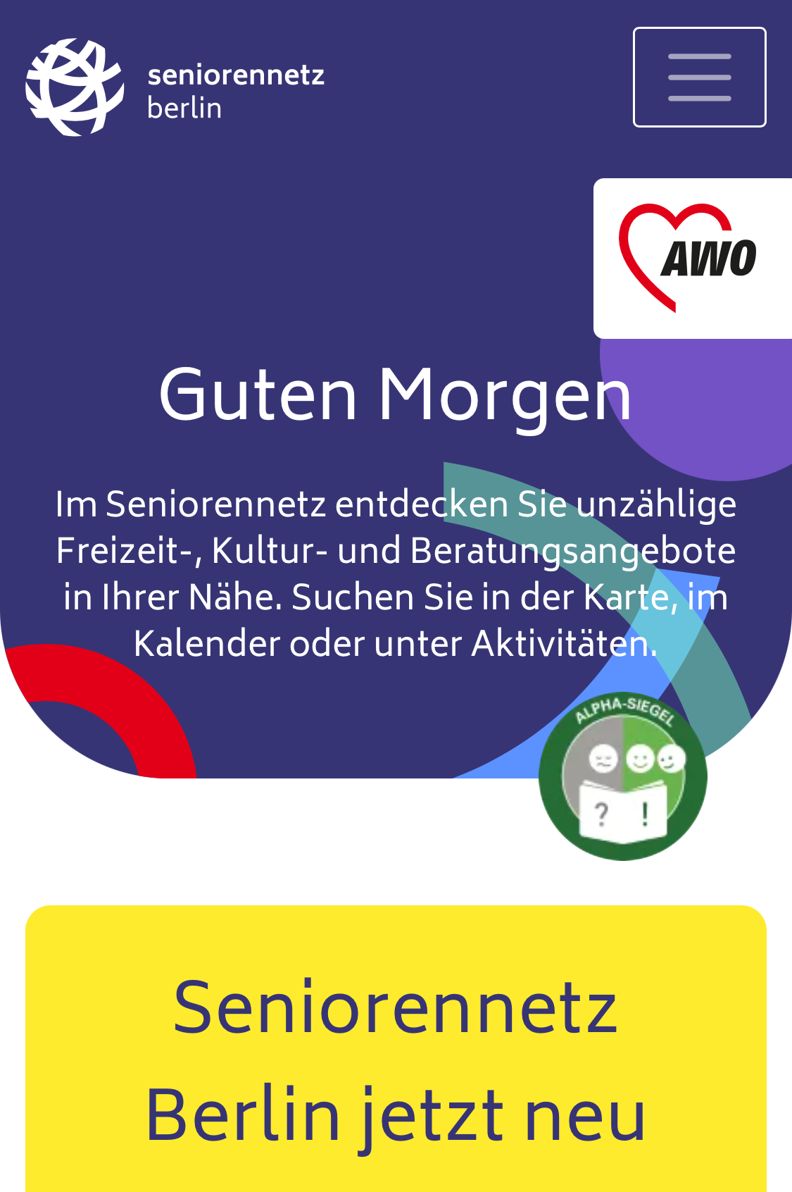 Sie können nach Themen, Veranstaltungsorten oder bezirksweise suchen, auf einer Karte, in einem Kalender oder per Texteingabe. Das Seniorennetz ist ein Angebot der AWO Berlin.