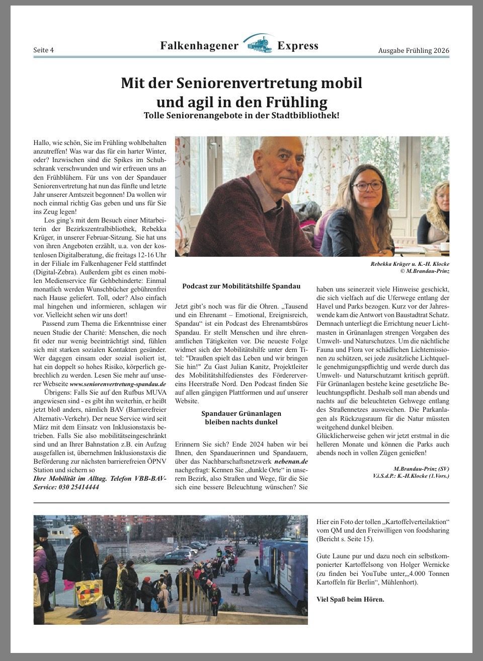 Im neuen Falkenhagener Express können Sie lesen, wie Sie mobil und agil in den Frühling starten können, wie die Nachfolgeregelung des BVG-MUVA funktioniert und welche tollen Seniorenangebote die Stadtbibliothek bietet.
